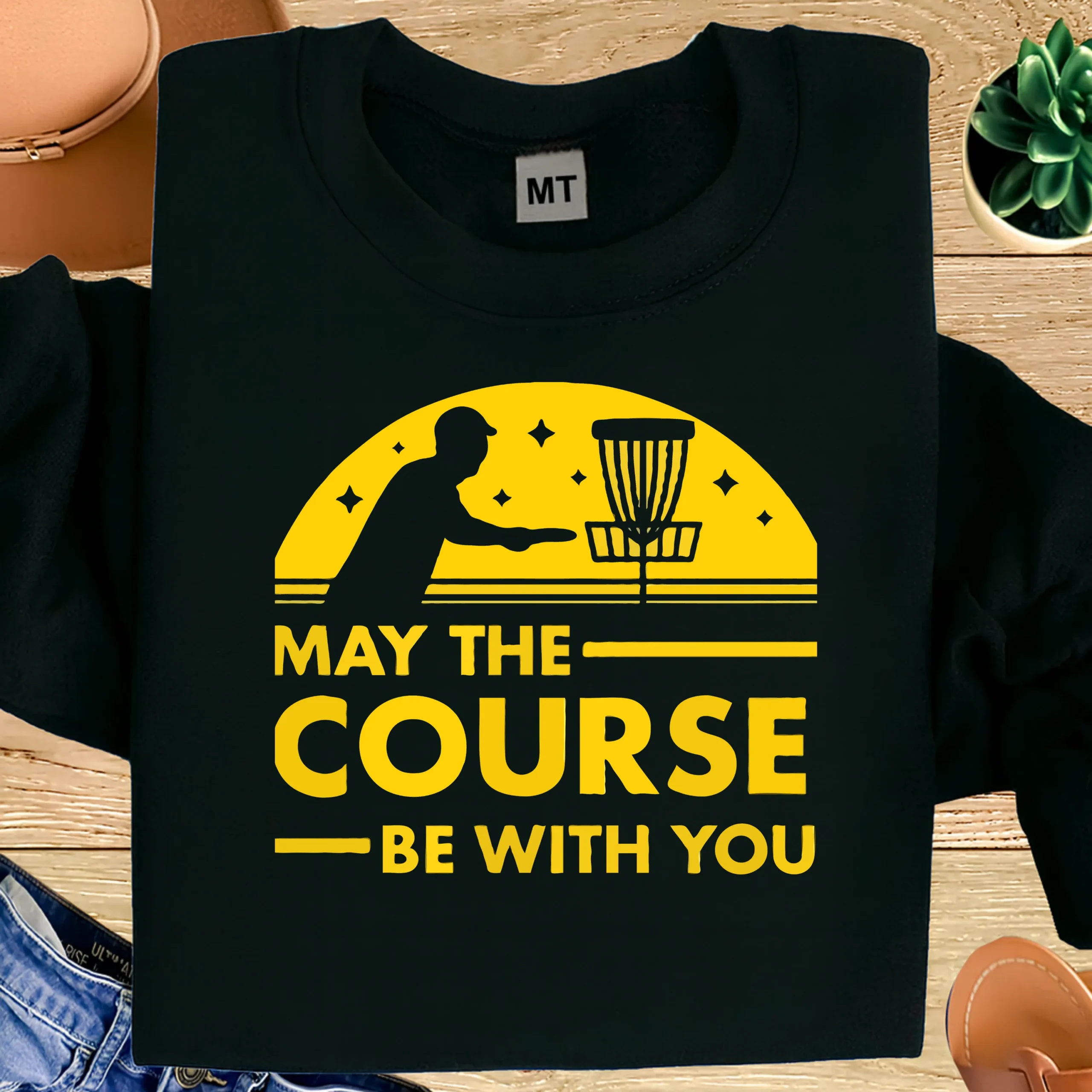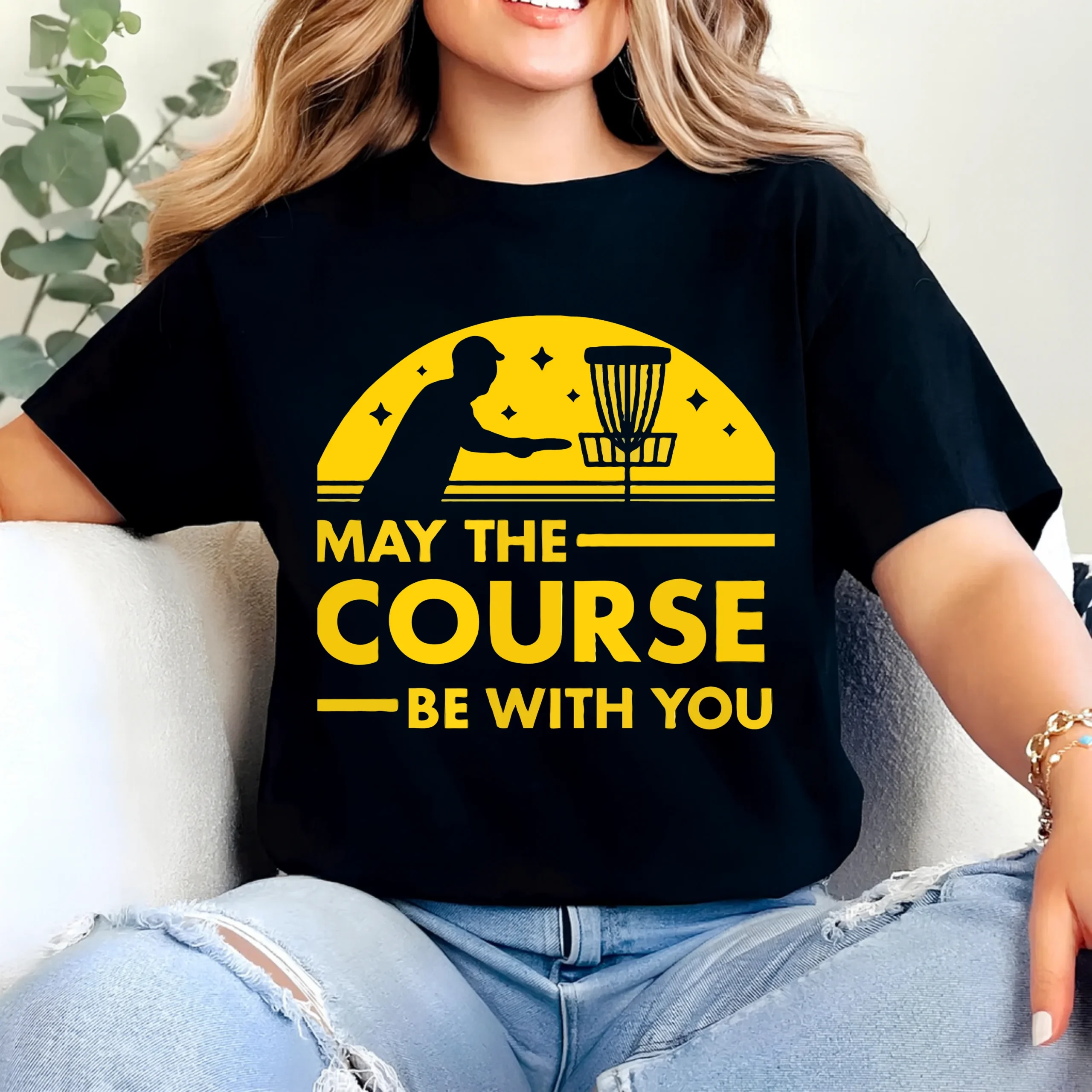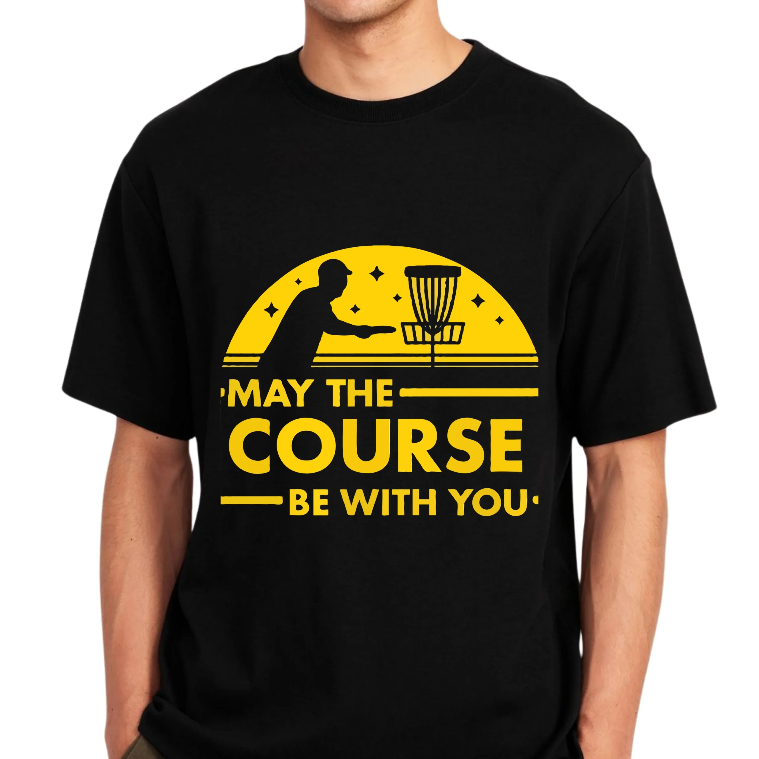 Bring humor to the fairway with this May The Course Be With You Disc Golf Shirt, a clever parody design every disc golfer will appreciate. Featuring a clean silhouette of a disc golfer lining up a putt with a basket under a bold sunset-style graphic, this shirt blends disc golf culture and pop-style humor perfectly.