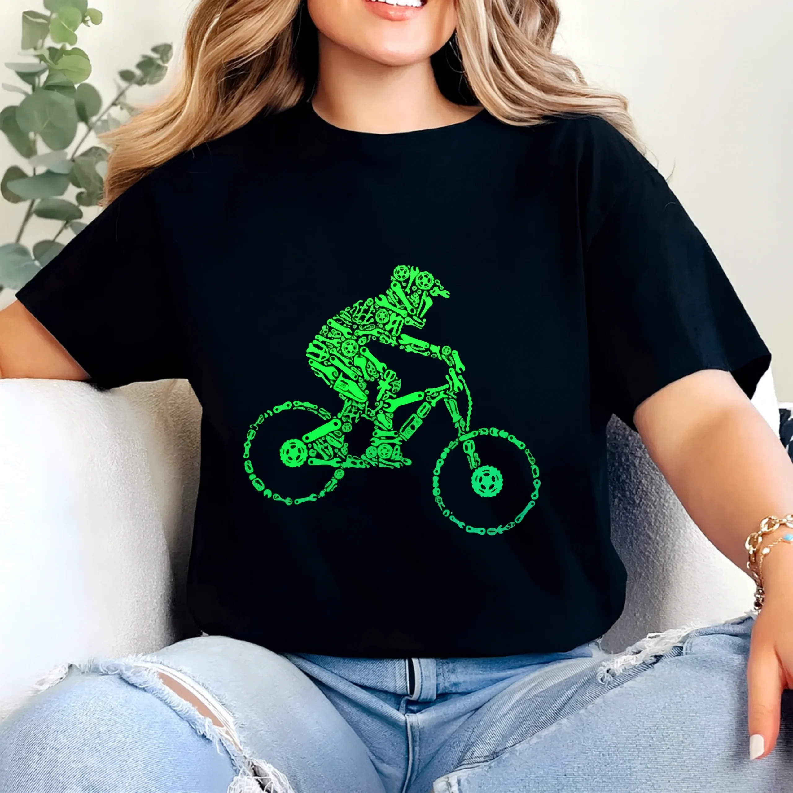 Made from high-quality premium cotton, this T-shirt is soft, breathable, and comfortable for daily wear, cycling meetups, or casual outings. The vibrant green graphic pops beautifully on the black fabric, giving it a bold and modern look.
