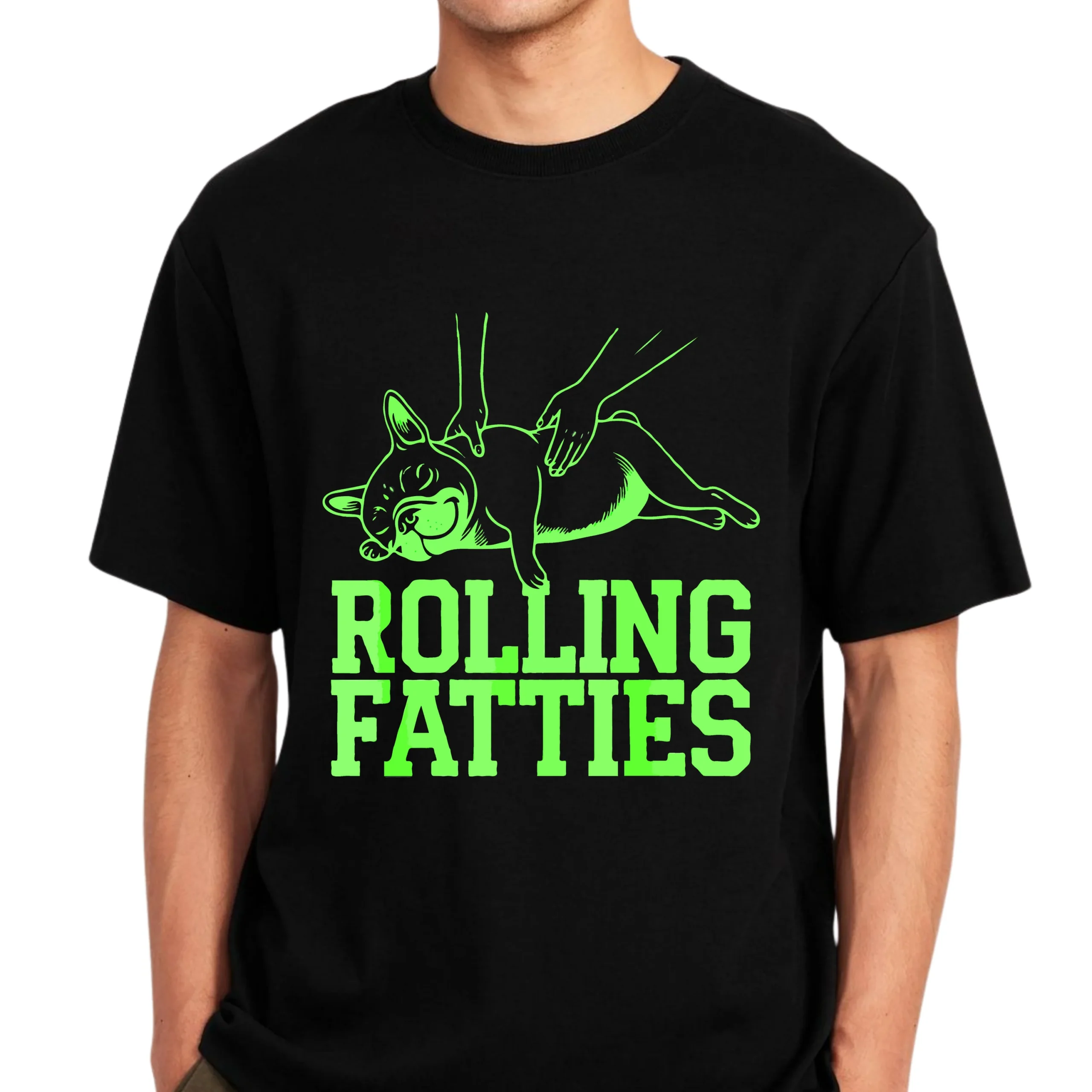 Add humor to your wardrobe with this Rolling Fatties French Bulldog T-Shirt, featuring a chubby Frenchie blissfully enjoying a belly massage. The playful neon green line-art design pops beautifully on a black background, making this tee both eye-catching and laugh-out-loud funny.