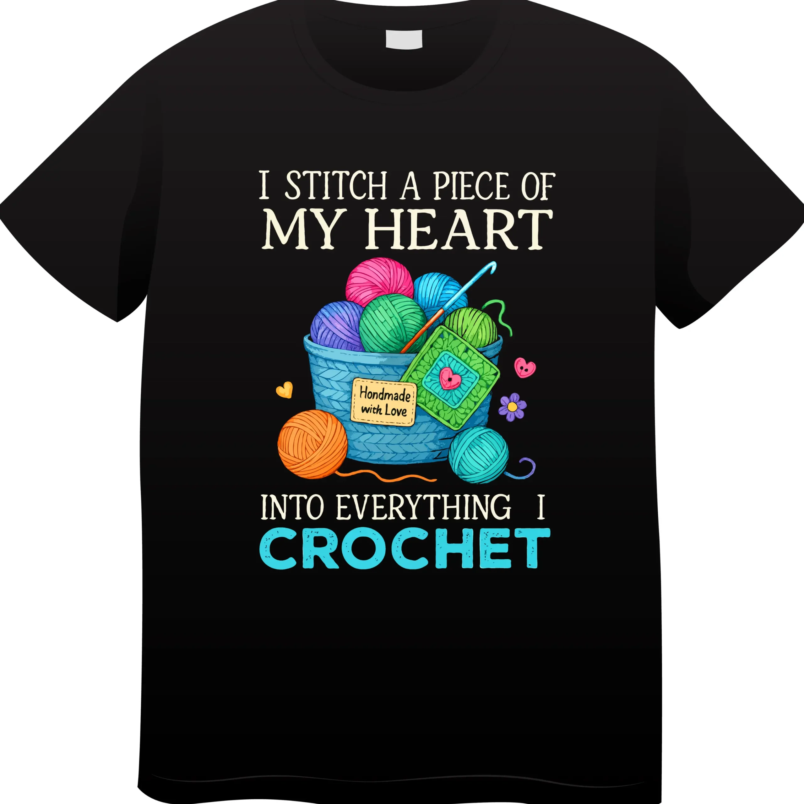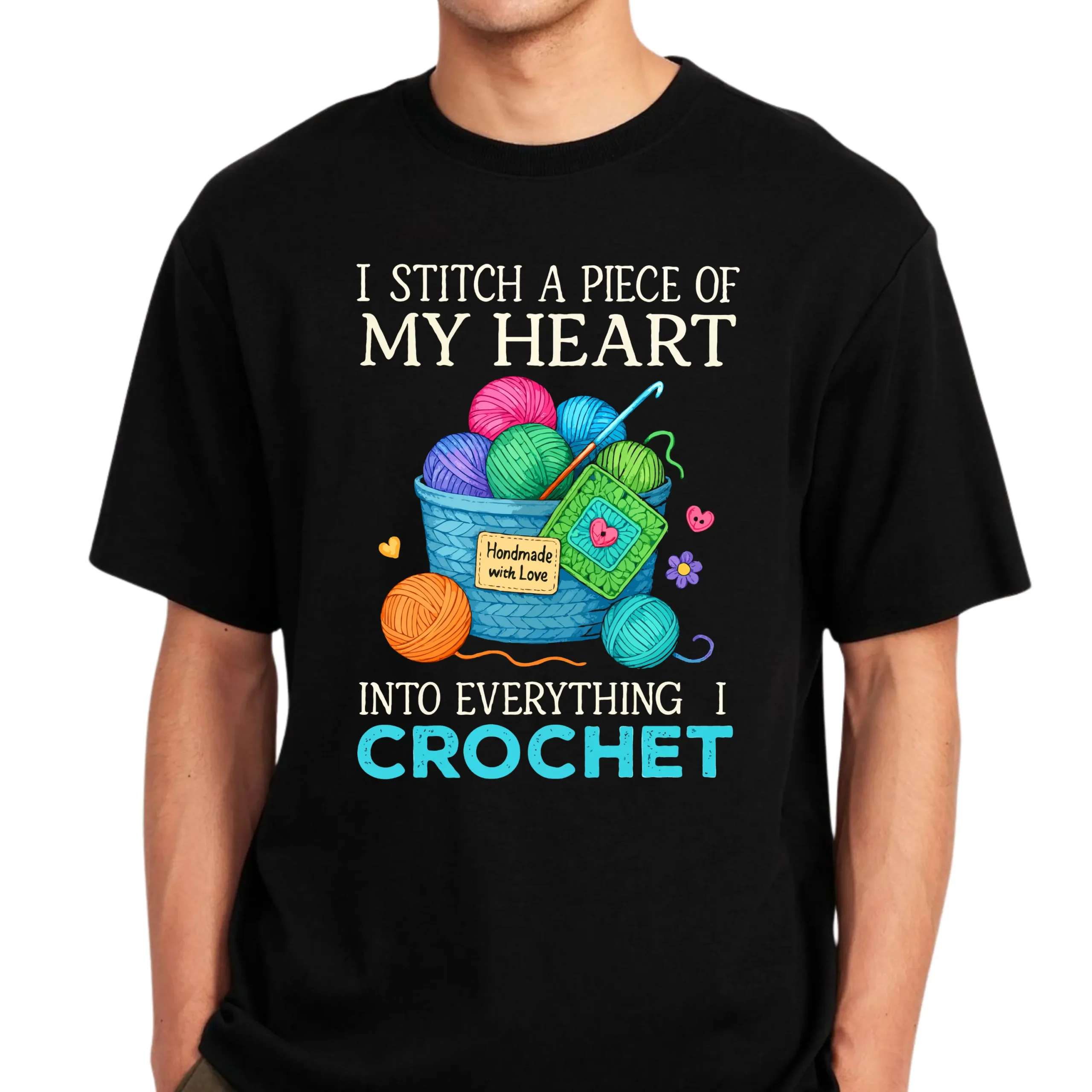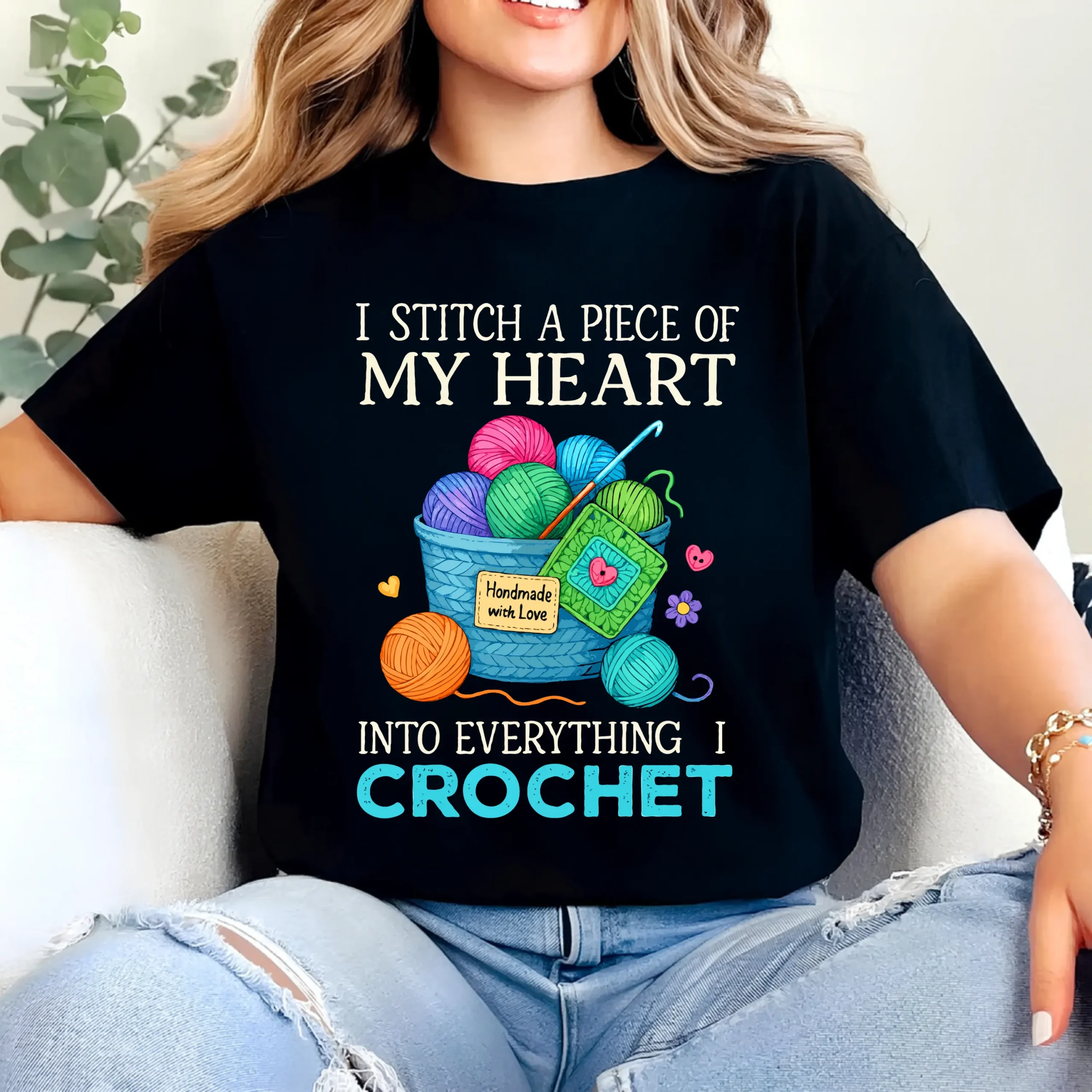 Premium 100% cotton crochet quote T-shirt featuring the message “I Stitch a Piece of My Heart Into Everything I Crochet.”Soft, breathable fabric with high-quality, fade-resistant print. Perfect for crochet lovers, handmade craft enthusiasts, and everyday casual wear. Available with fast delivery across the UAE.