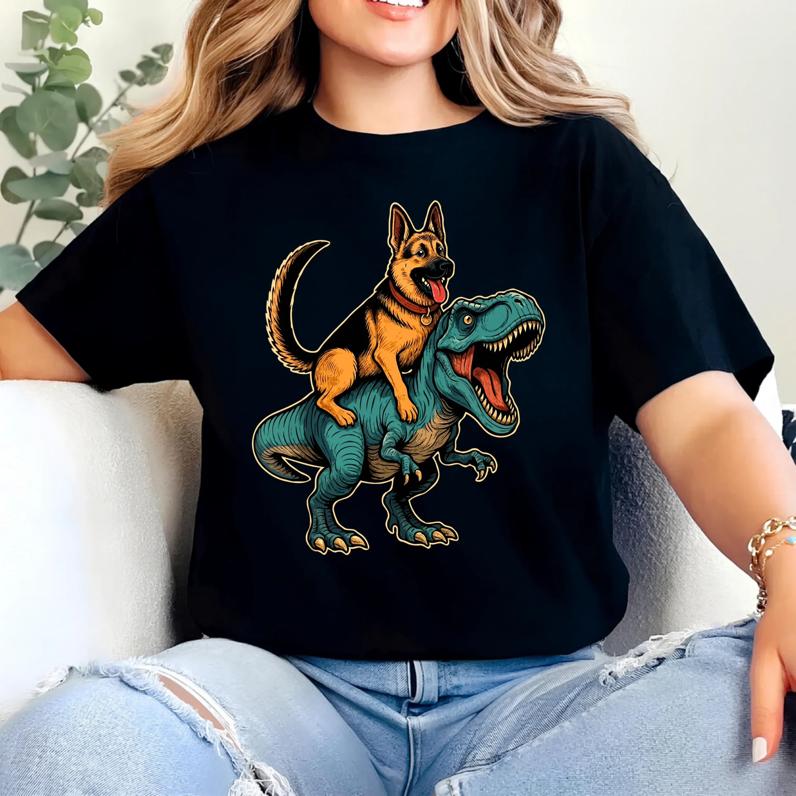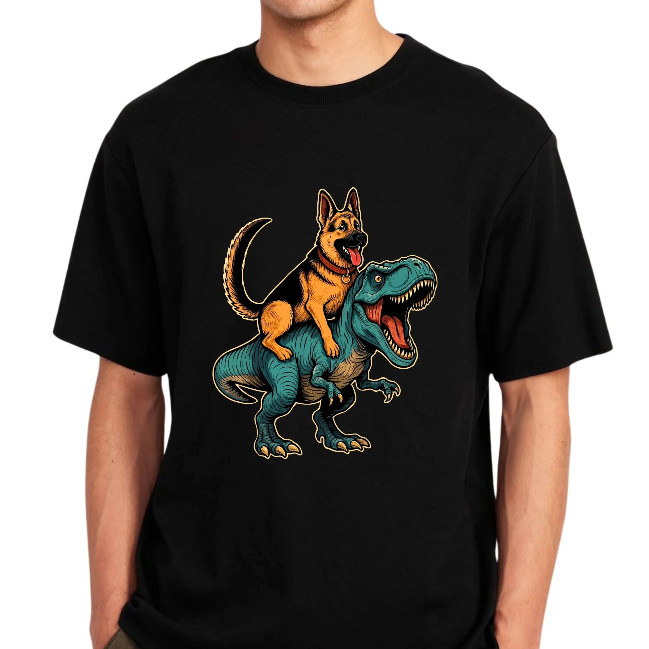 100% premium cotton. A hilarious and bold design featuring a German Shepherd riding a roaring dinosaur—perfect for dog lovers with a sense of humor.