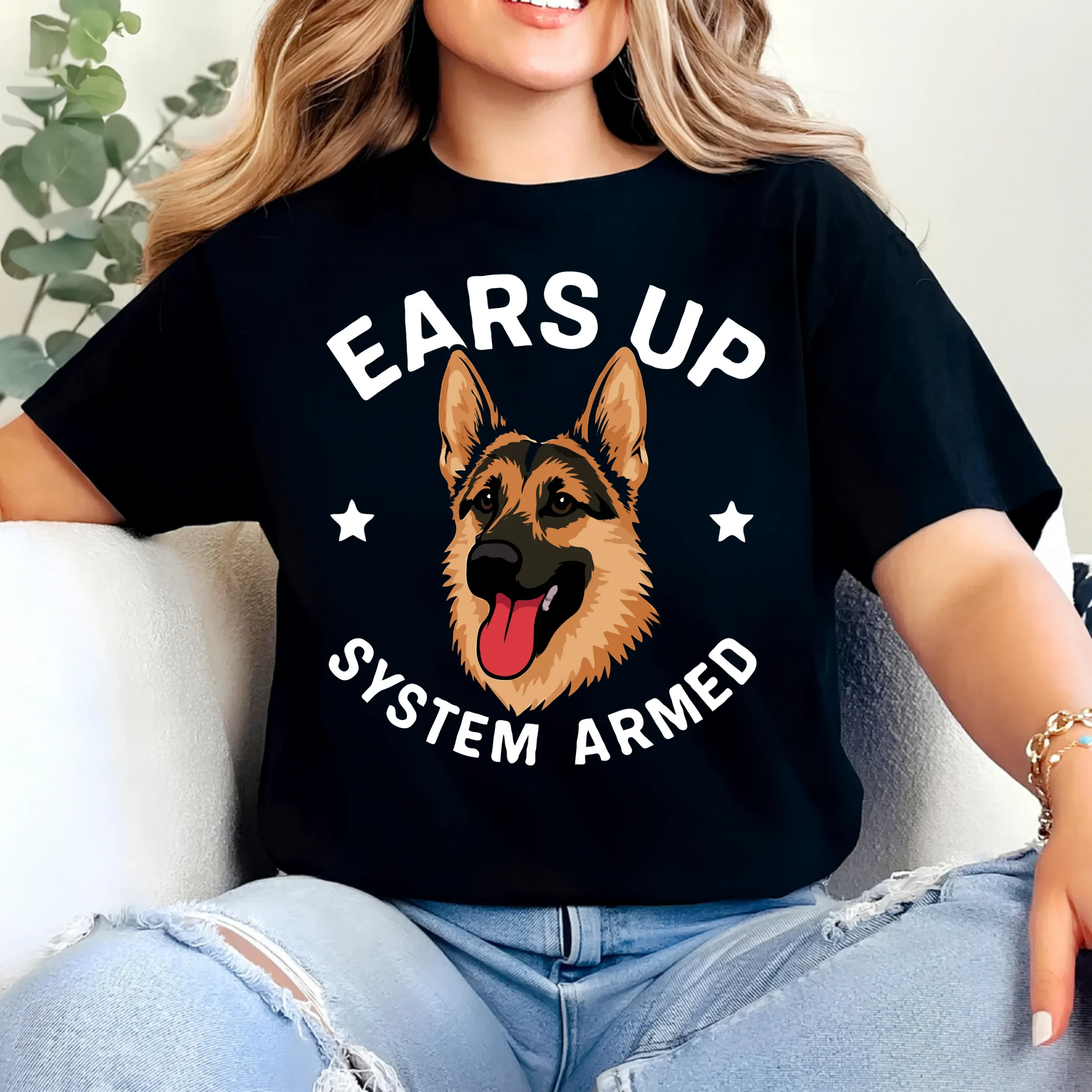 Let everyone know your German Shepherd is always on duty with this hilarious “Ears Up – System Armed” t-shirt. Featuring a bold German Shepherd illustration with alert ears and playful warning text, this design is perfect for dog lovers who appreciate humor with attitude.