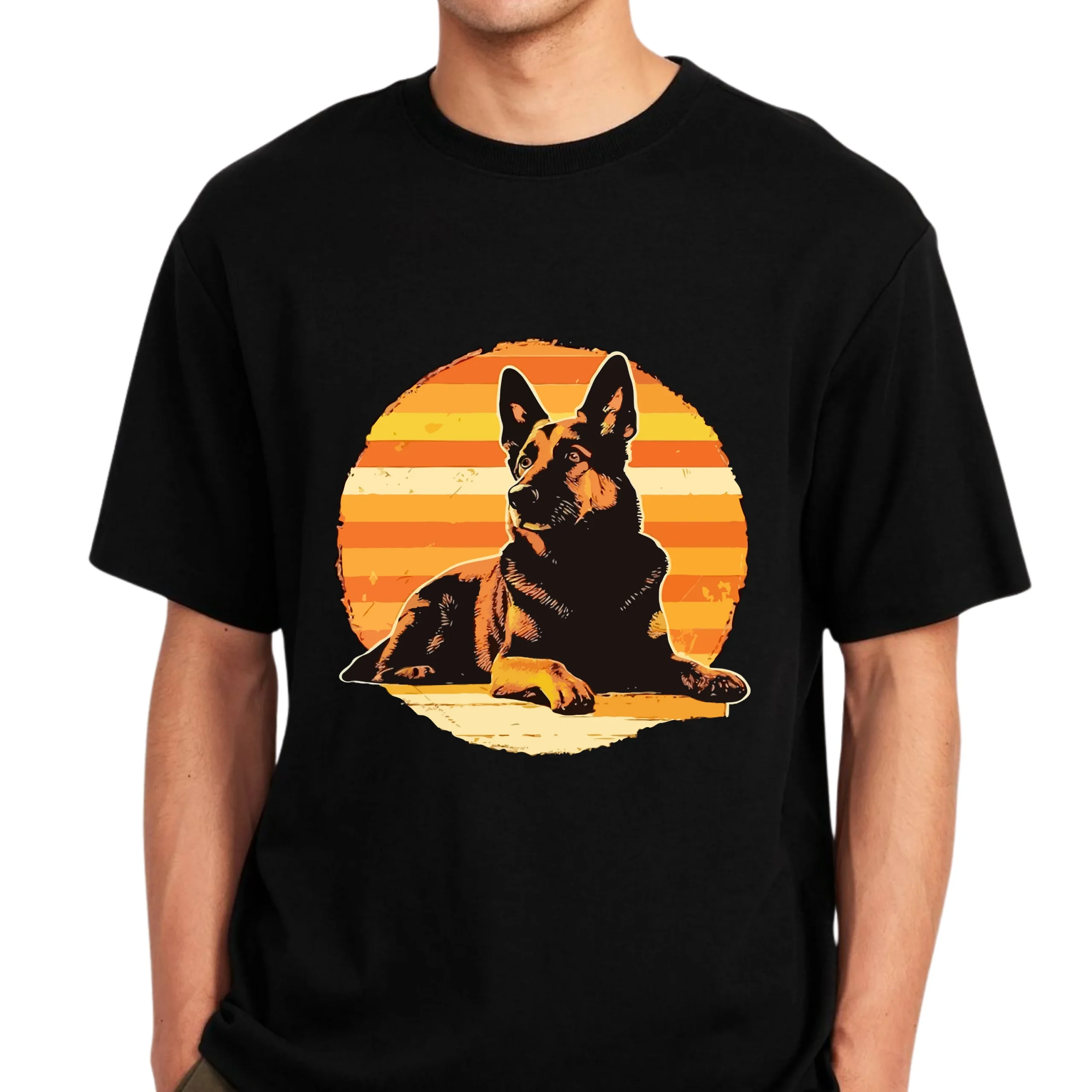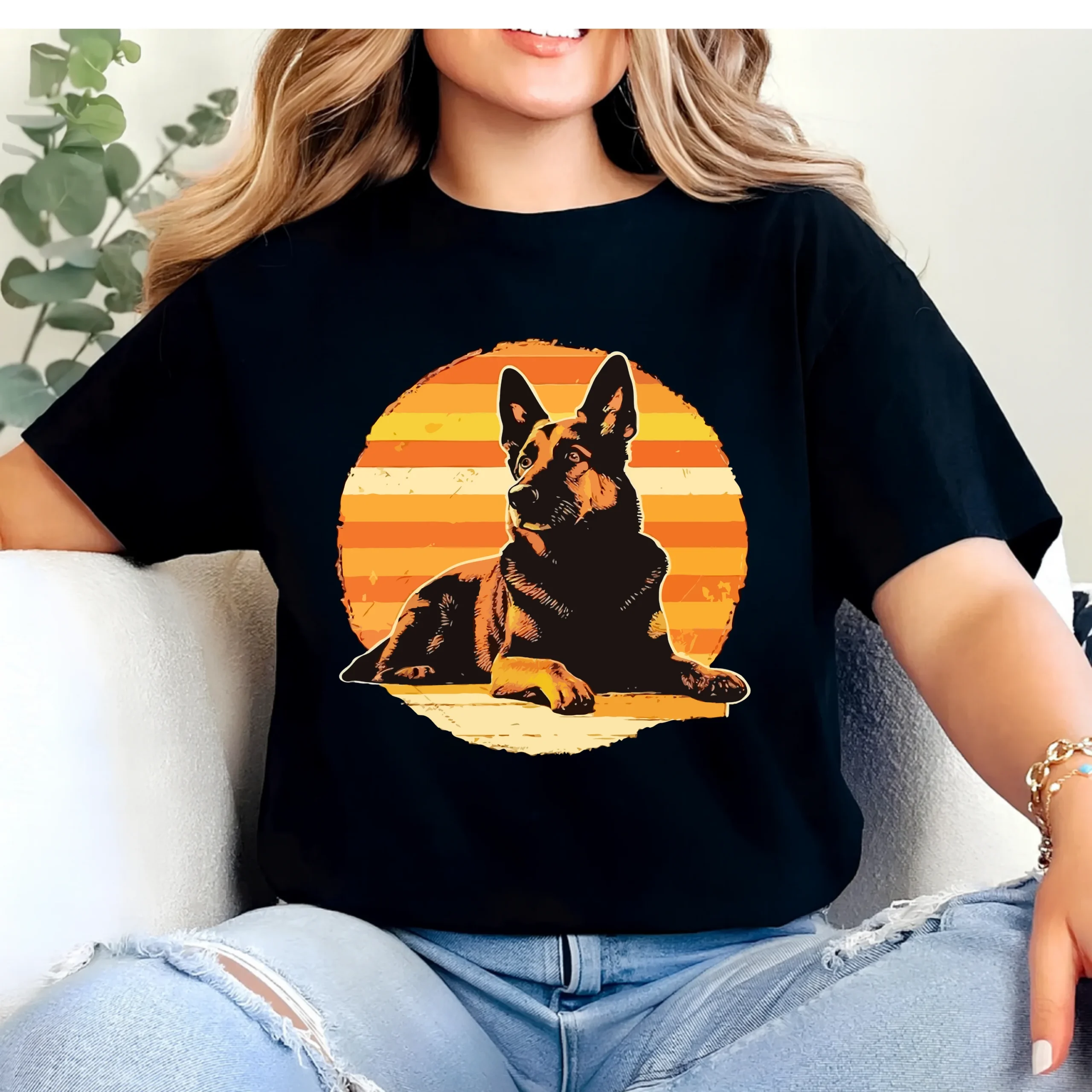 Perfect for German Shepherd owners, dog lovers, and fans of vintage aesthetics, this shirt blends bold artwork with a timeless color palette. The circular sunset design pops perfectly on dark fabric, making it an eye-catching everyday tee.