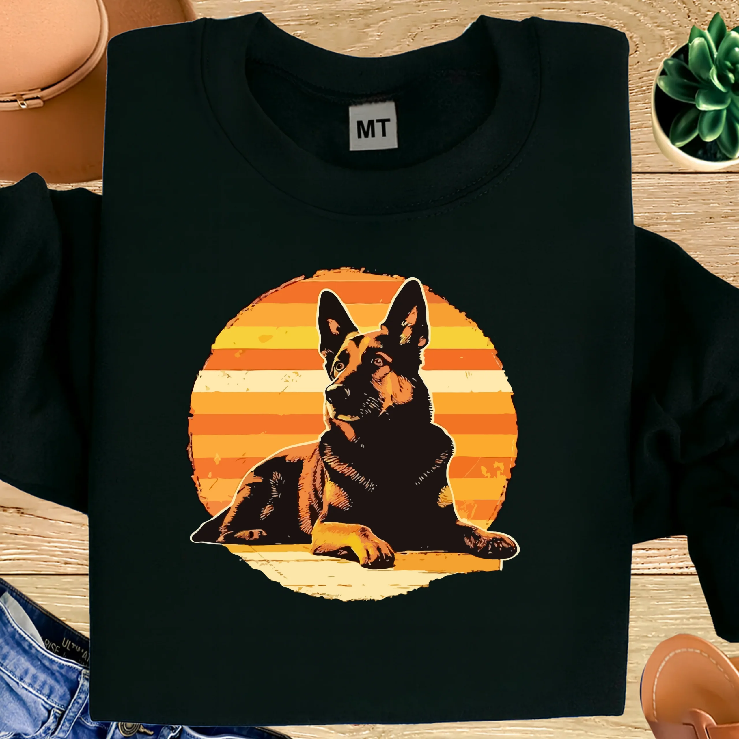 100% premium cotton. A timeless German Shepherd design with a warm retro sunset vibe 🌅🐕