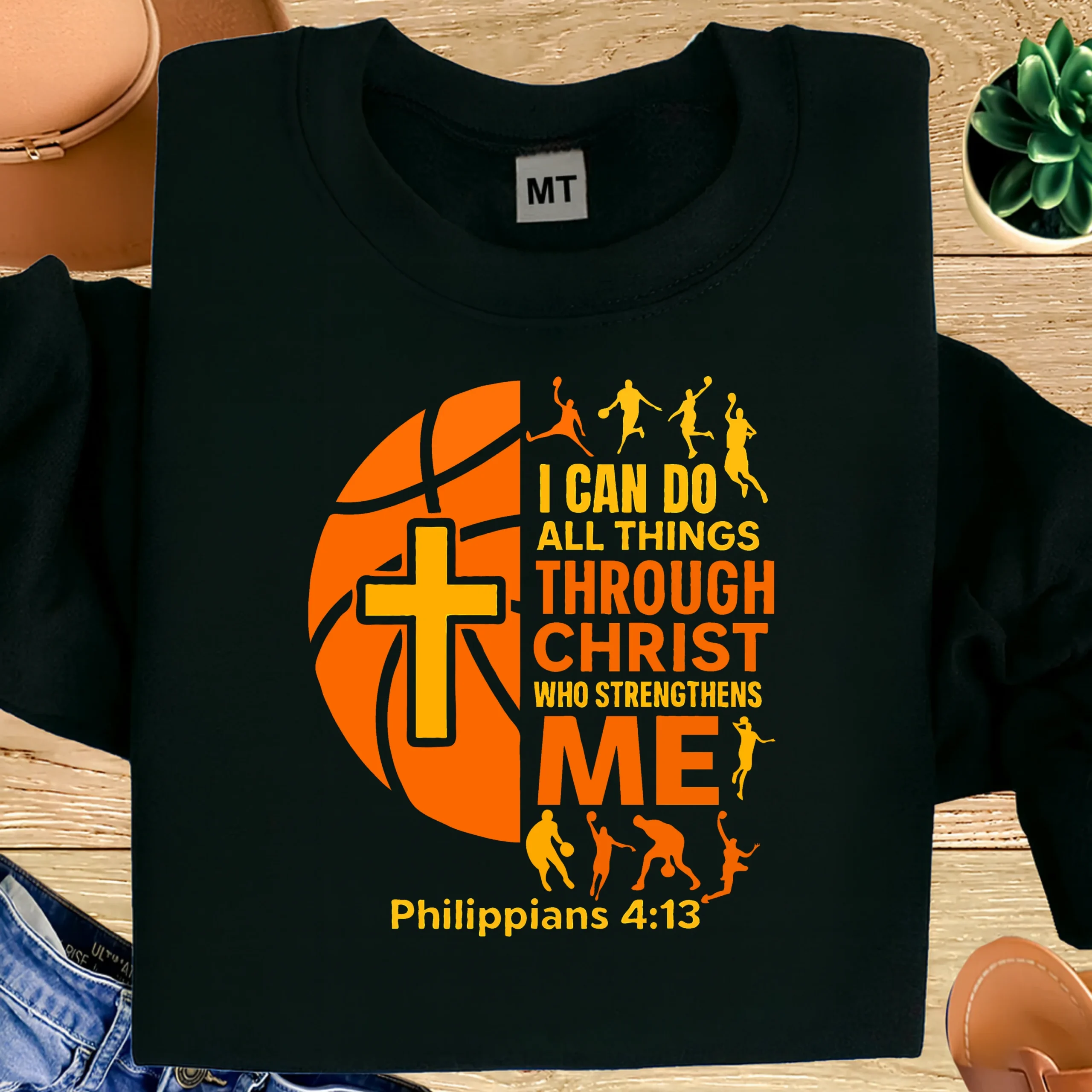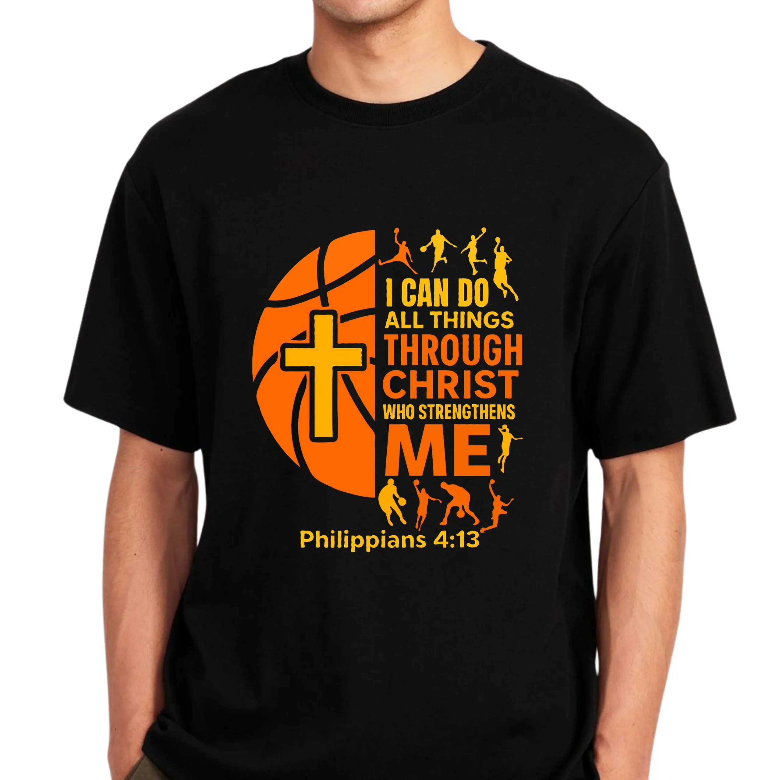 Perfect for Christian basketball players, coaches, teams, and faith-driven athletes, this shirt is a reminder that strength comes through Christ—on the court and in life. The warm orange and yellow tones pop beautifully against the black fabric, creating a striking and meaningful look.