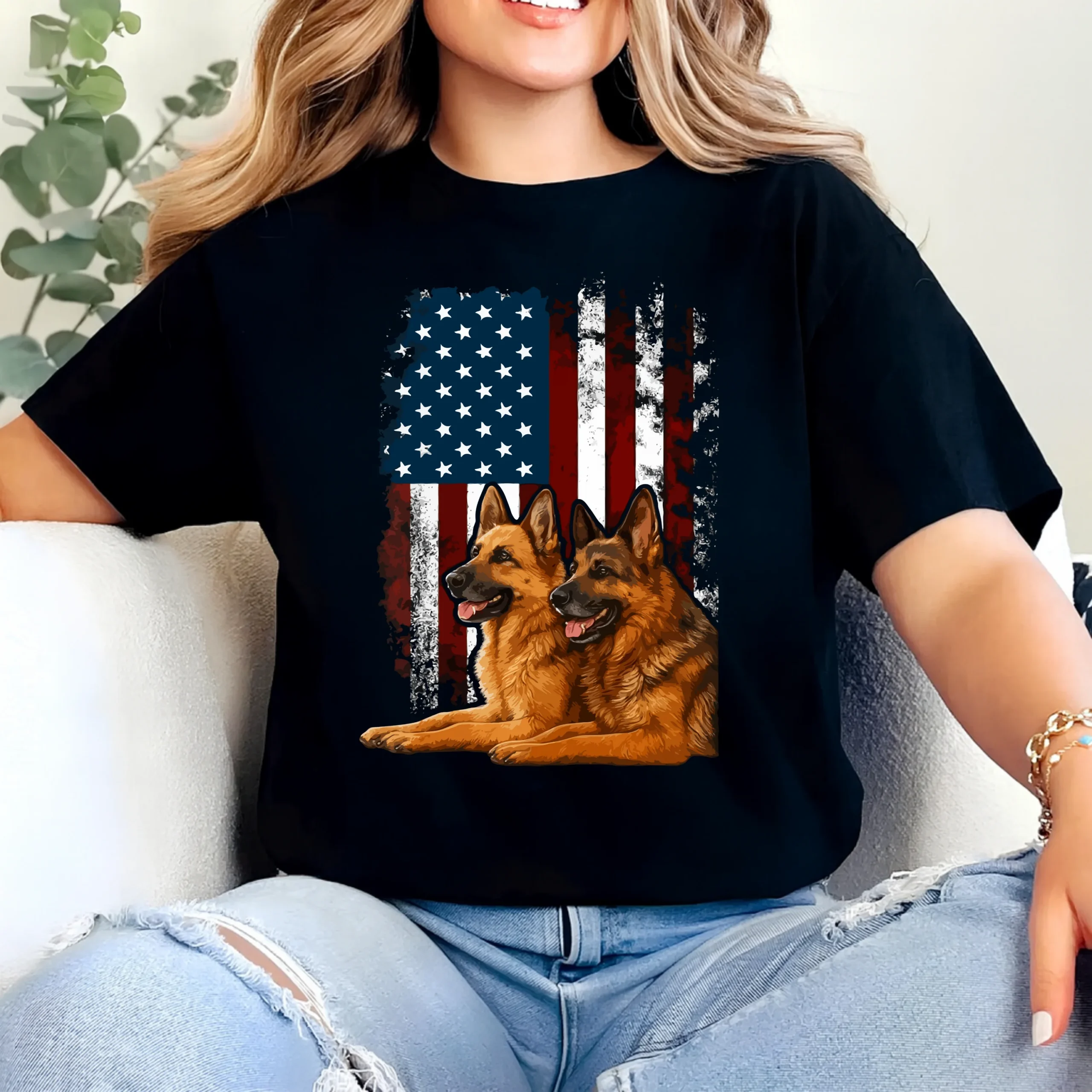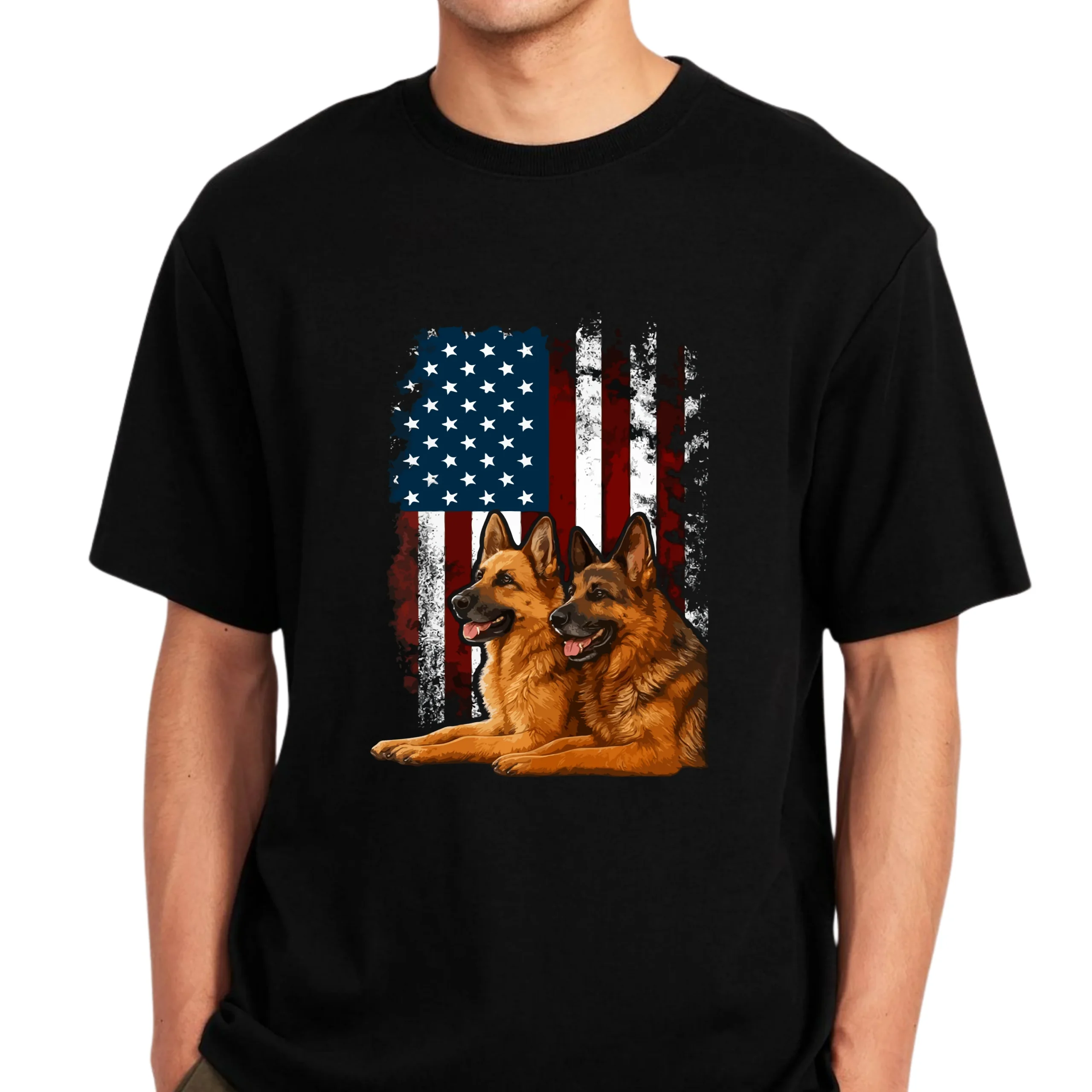 This shirt is perfect for dog lovers, patriotic Americans, military supporters, and German Shepherd owners who want to wear their pride boldly. The high-contrast artwork pops beautifully on a black background, making it eye-catching and meaningful.