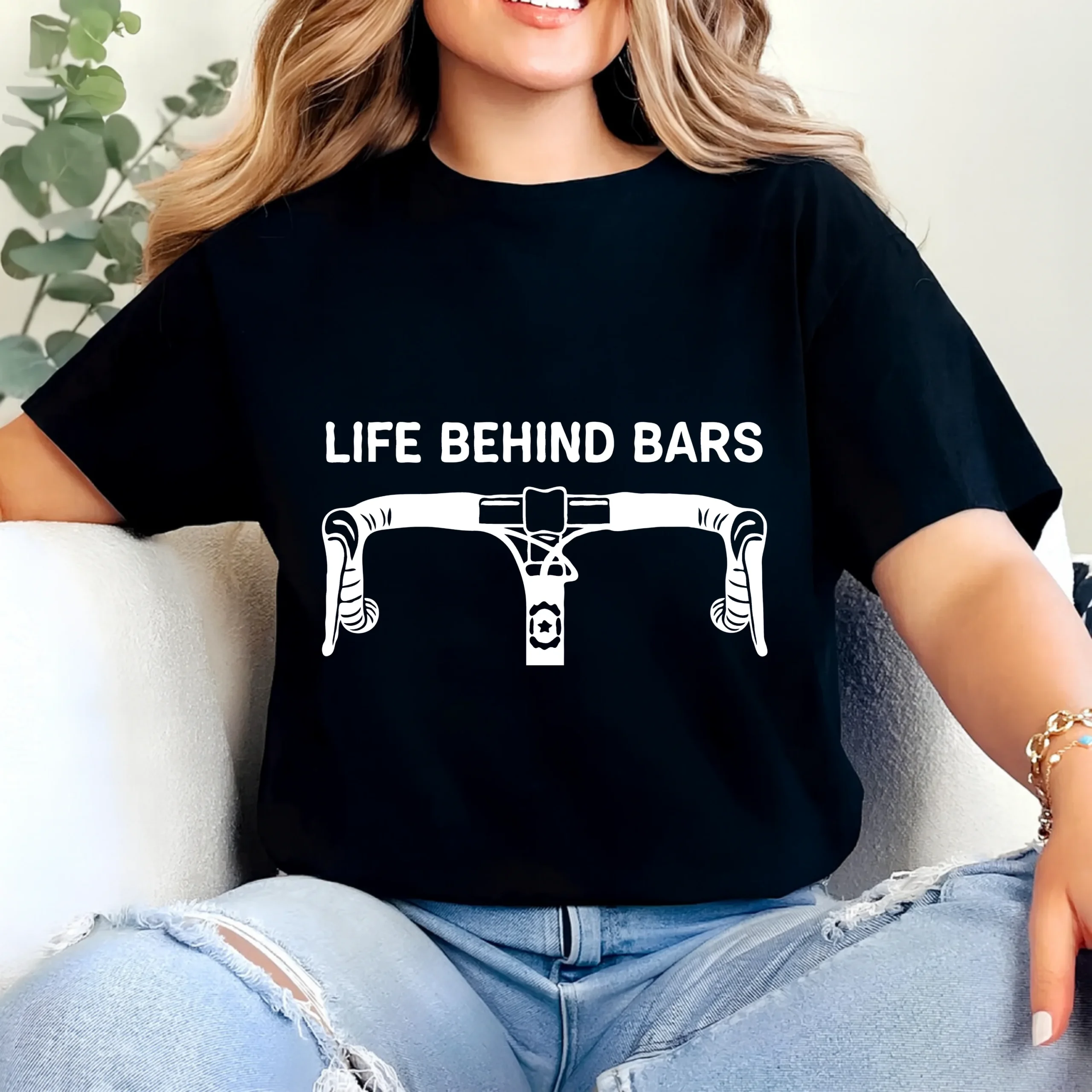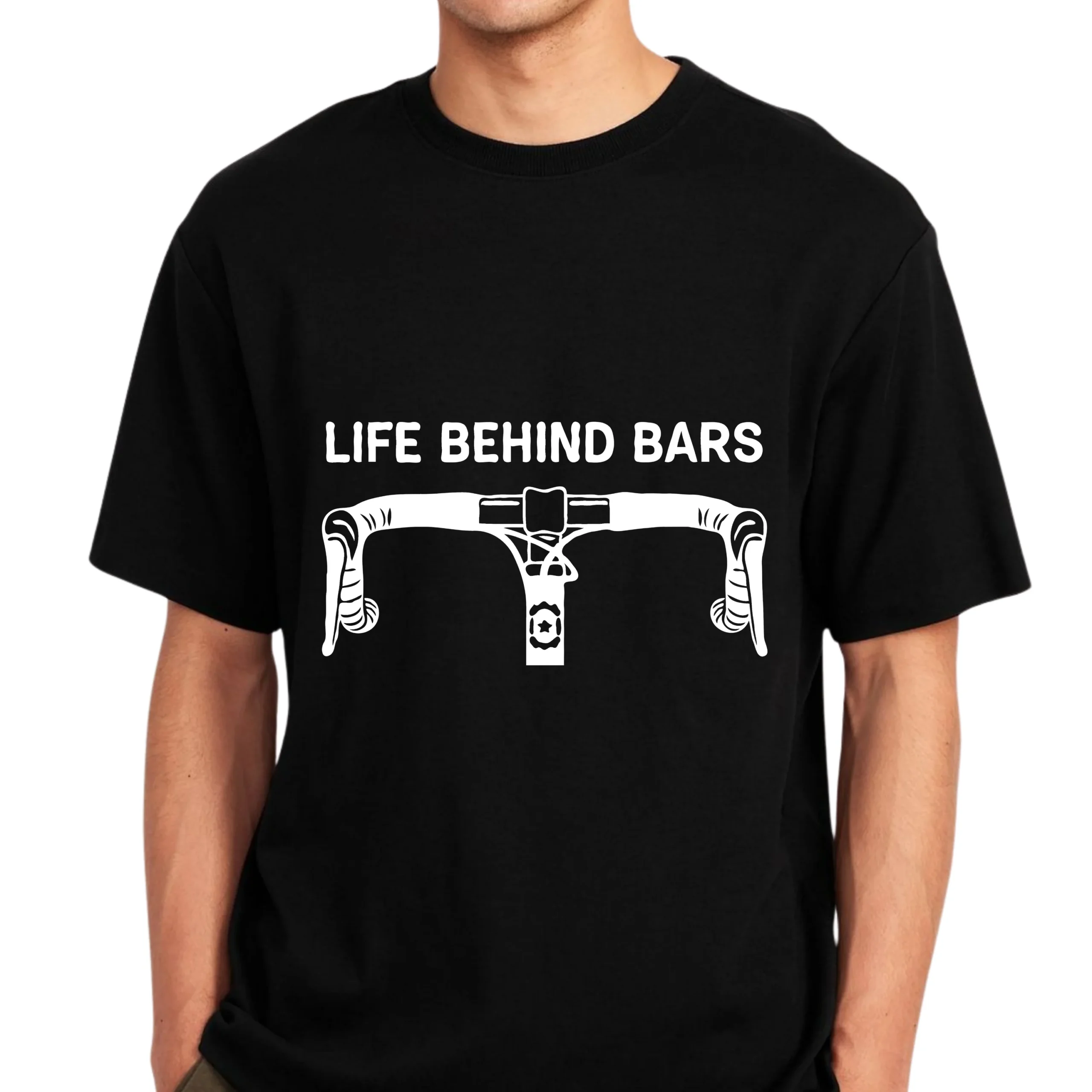 100% Premium cotton, Minimalist cycling t-shirt with the iconic “Life Behind Bars” slogan and road bike handlebar graphic.