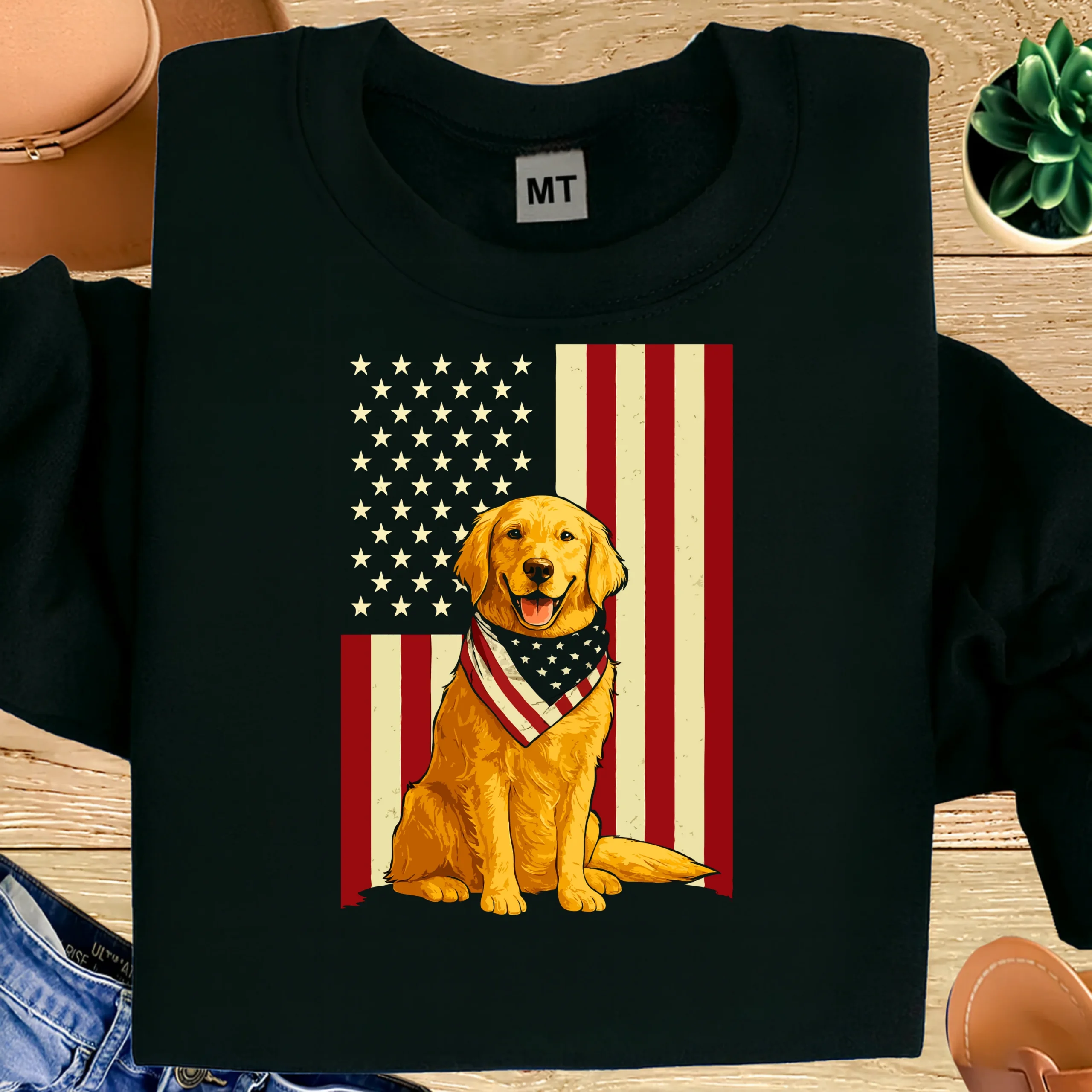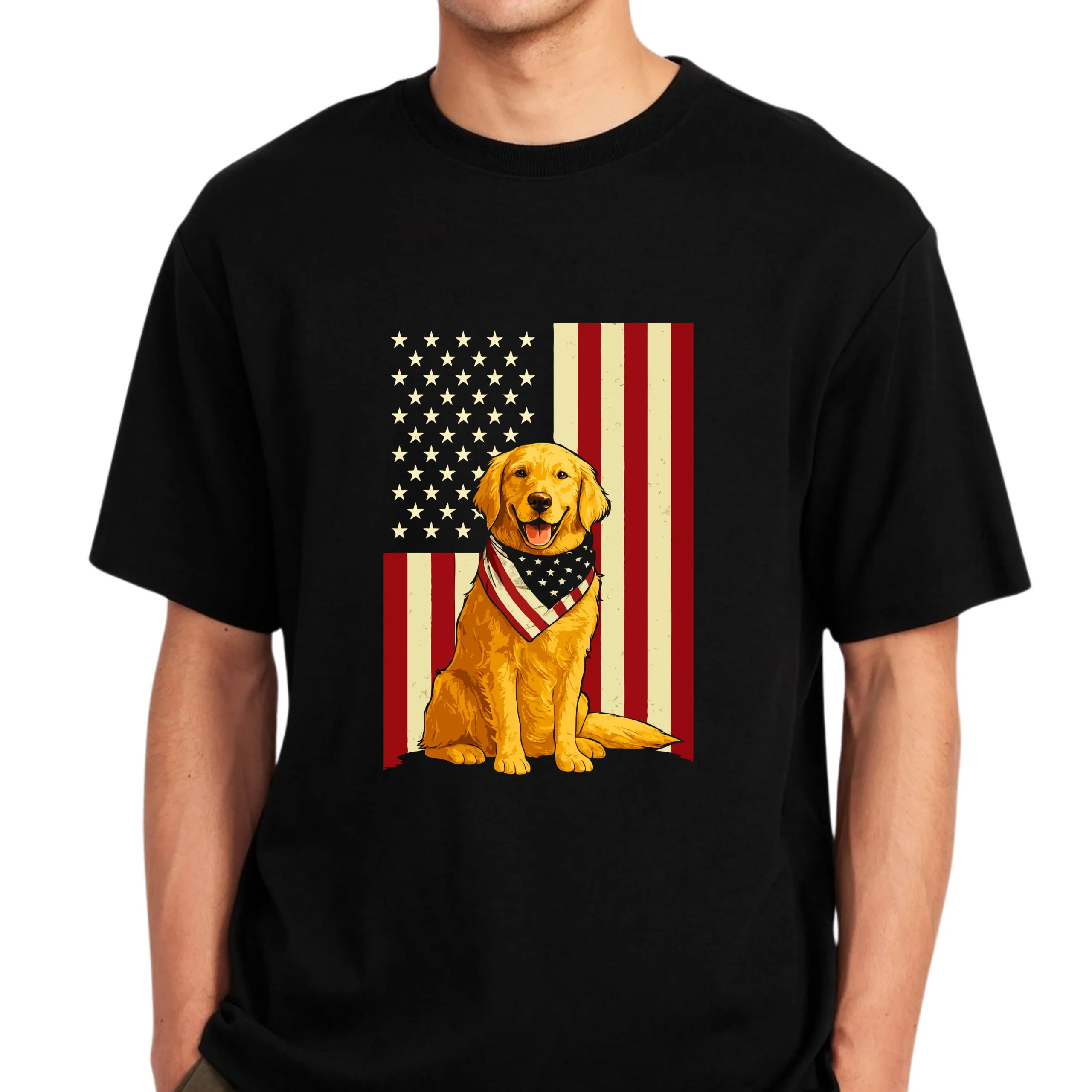 The detailed artwork, vintage-style flag colors, and friendly golden retriever expression make this shirt a favorite for dog parents and patriots alike.