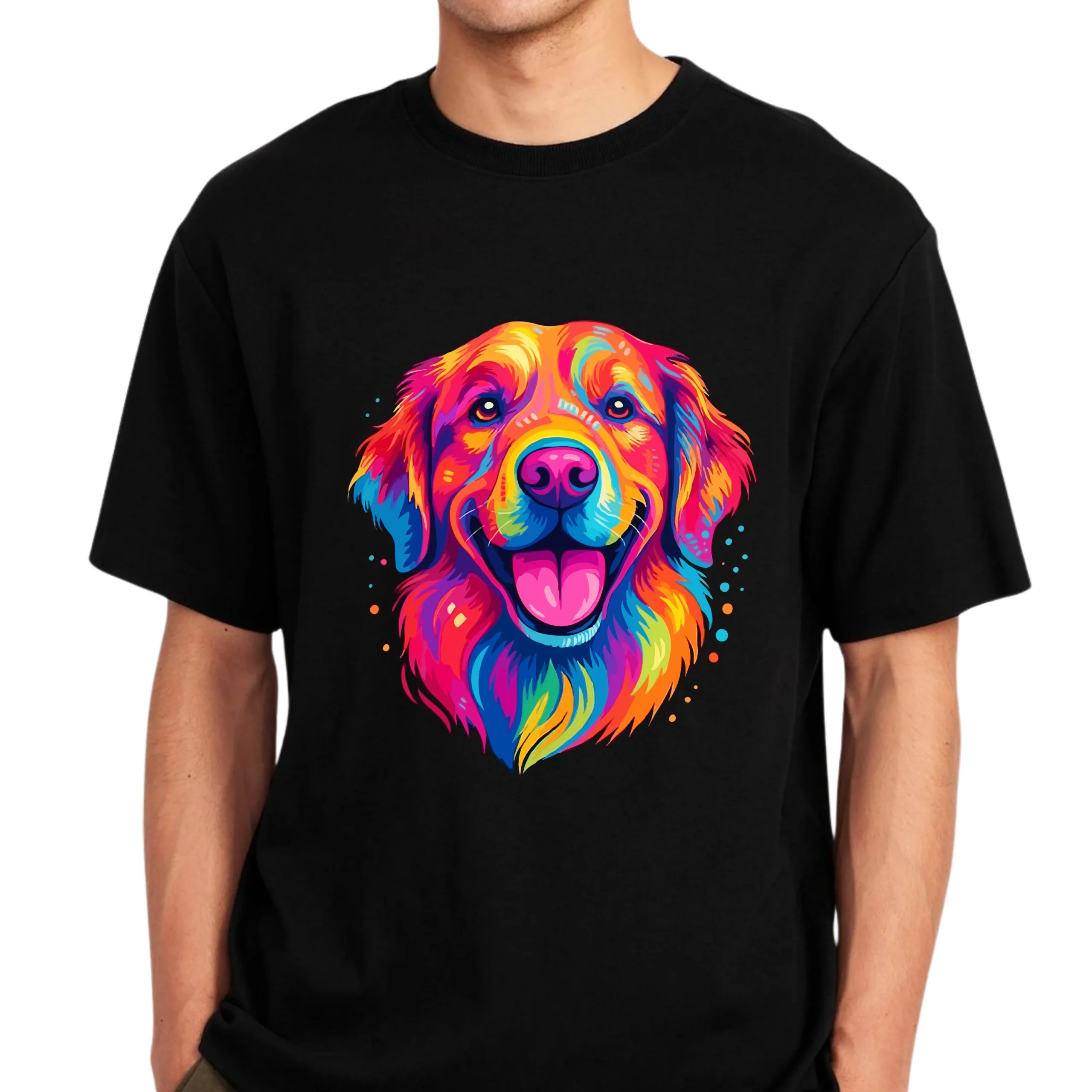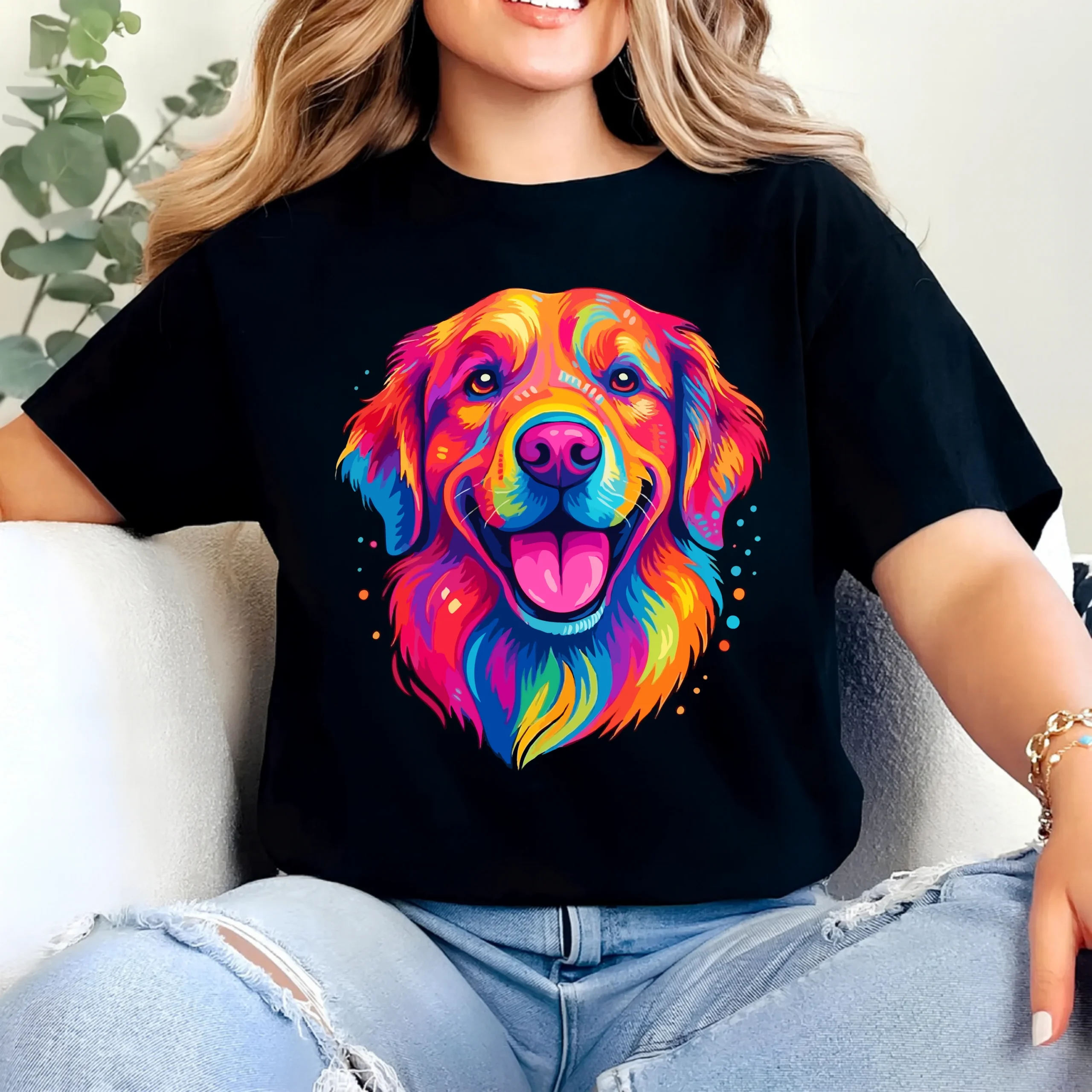 Perfect for casual outfits, festivals, art lovers, dog park days, gifts, or everyday wear, this design pops beautifully on dark fabric and instantly grabs attention. Whether you’re a proud golden retriever owner or simply love colorful dog art, this shirt delivers happiness at first glance.