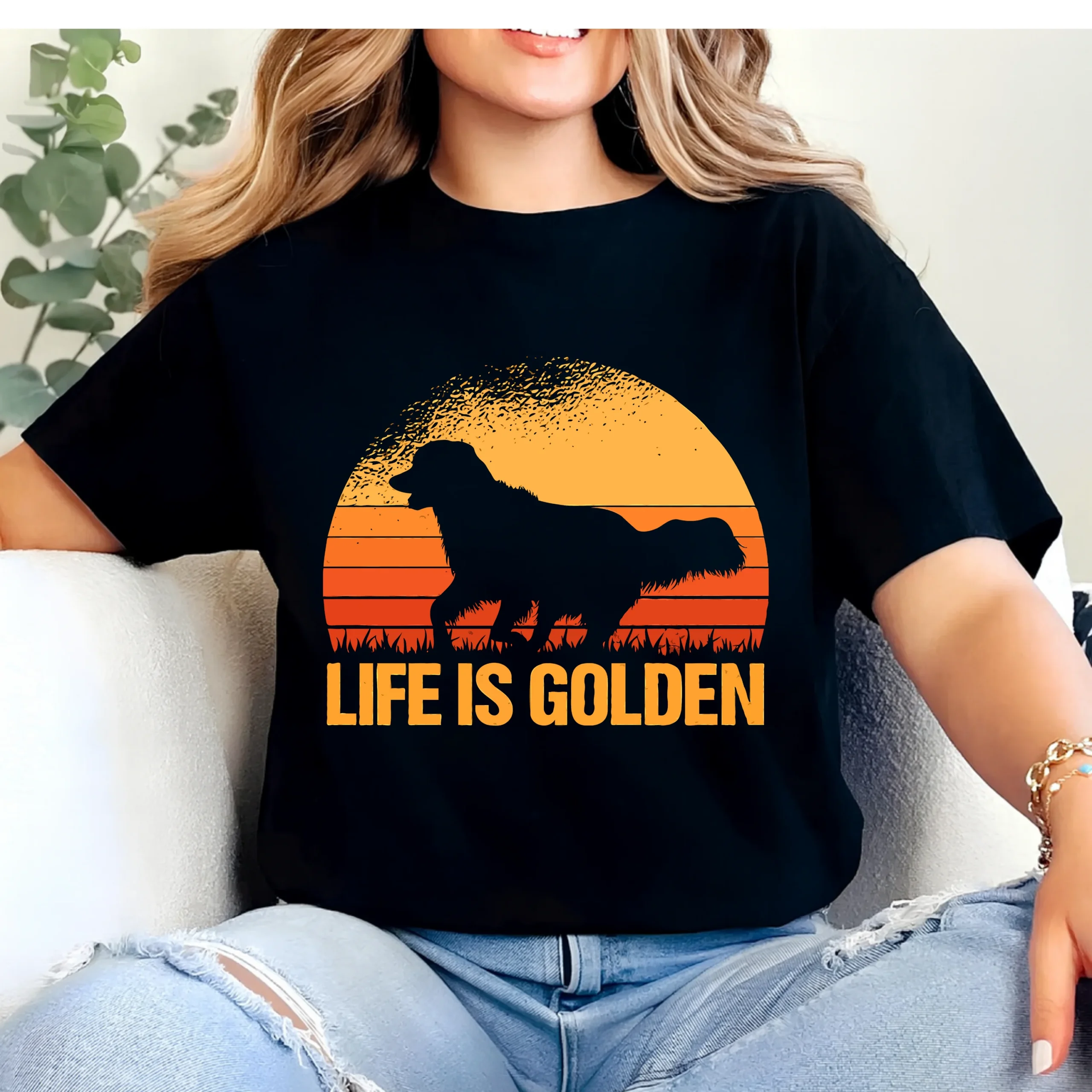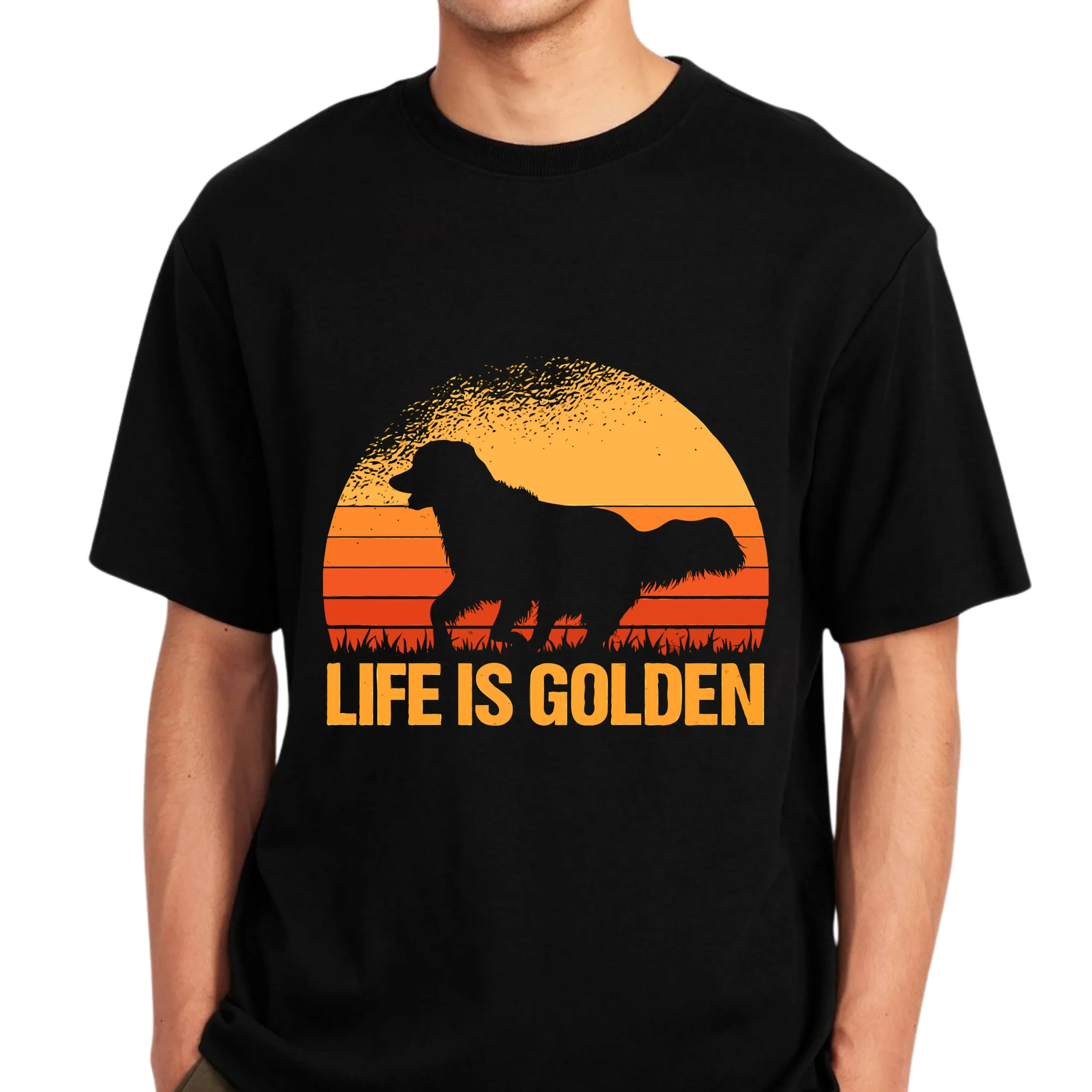 100% premium cotton. A warm “Life Is Golden” golden retriever shirt with a retro sunset silhouette—perfect for dog lovers who know happiness has four legs 🐾