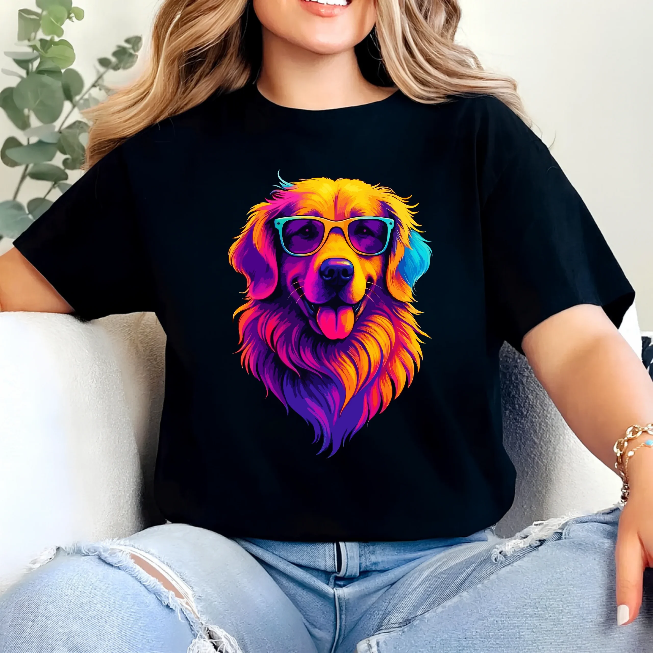 Turn heads and spread happy vibes with this Rainbow Golden Retriever Shirt, featuring a stunning neon-style illustration of a smiling golden retriever wearing sunglasses. Designed with bold, vibrant colors that pop against a dark background, this shirt is perfect for anyone who loves golden retrievers and expressive, artistic fashion.