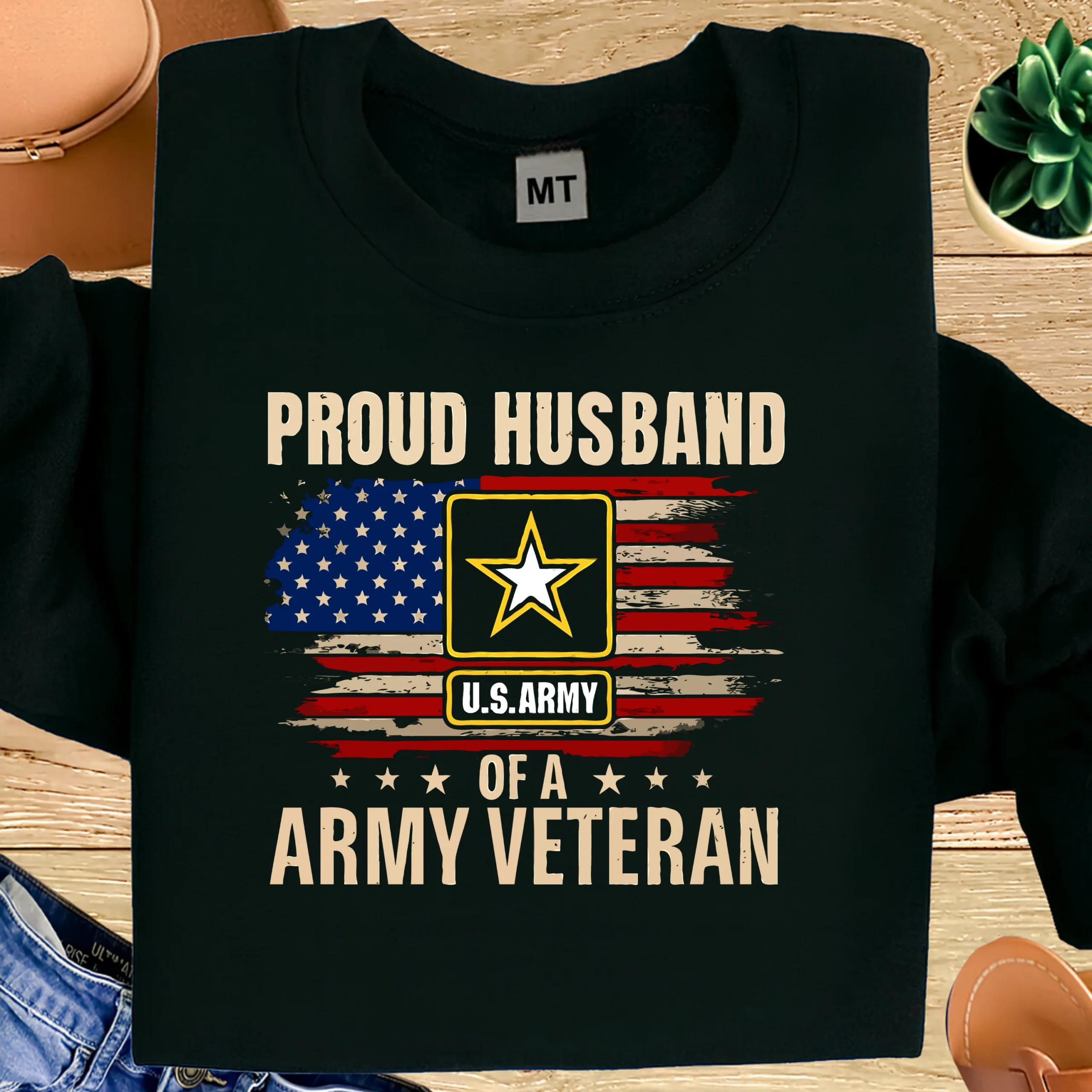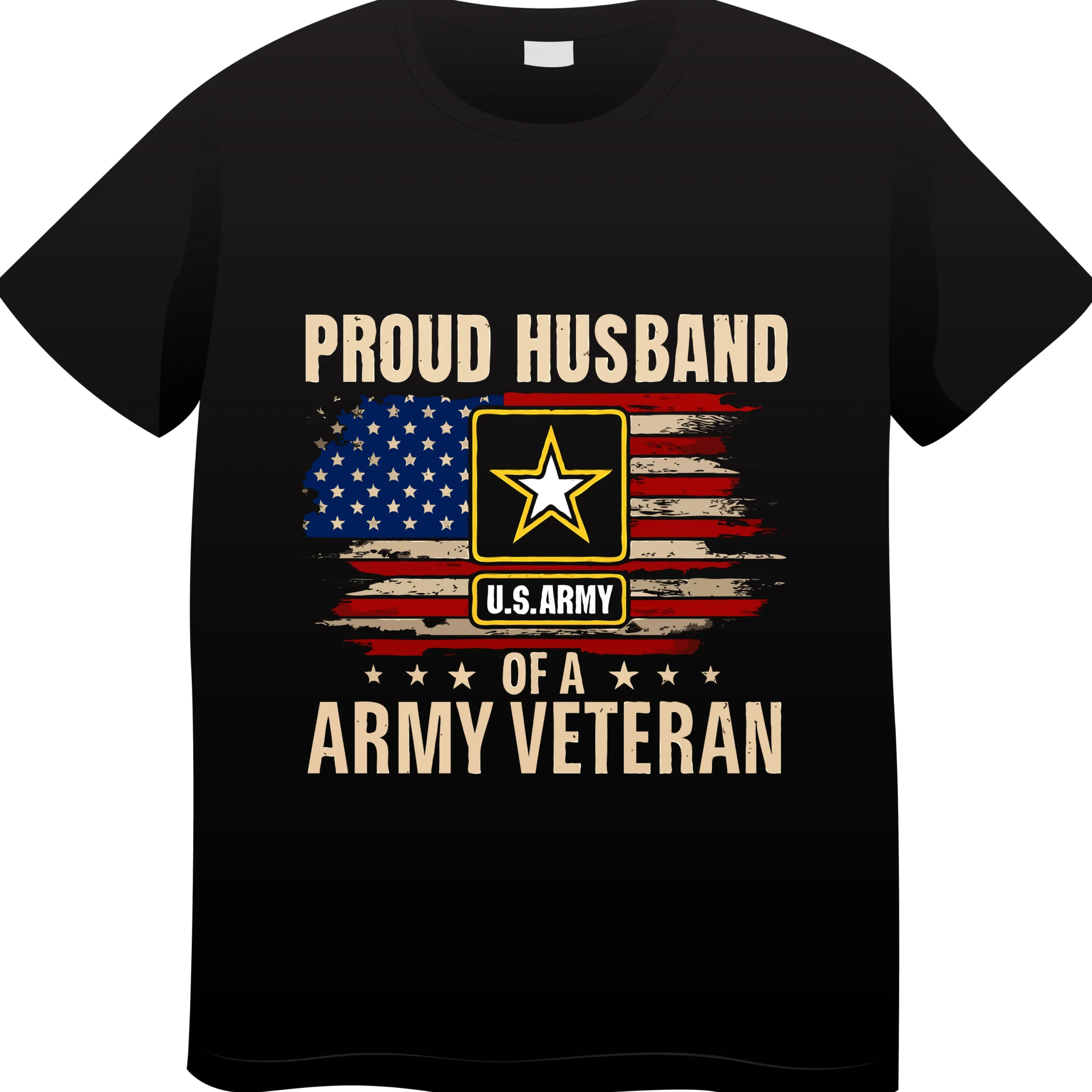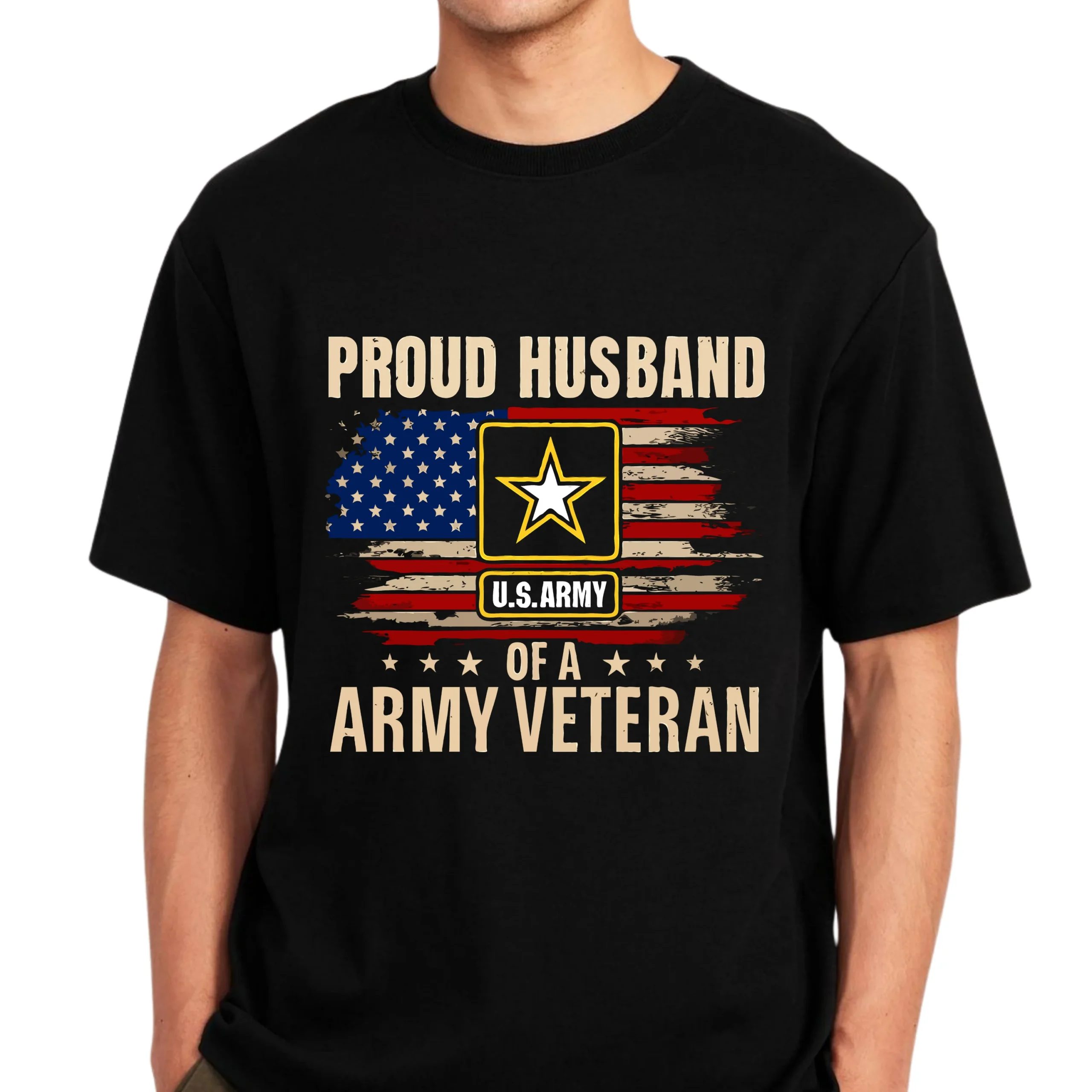 Show your love and respect with the Proud Husband of a U.S. Army Veteran T-Shirt, designed to celebrate the strength of military families. Featuring a distressed American flag background, official-style U.S. Army emblem, and bold statement text, this design represents honor, loyalty, and pride.