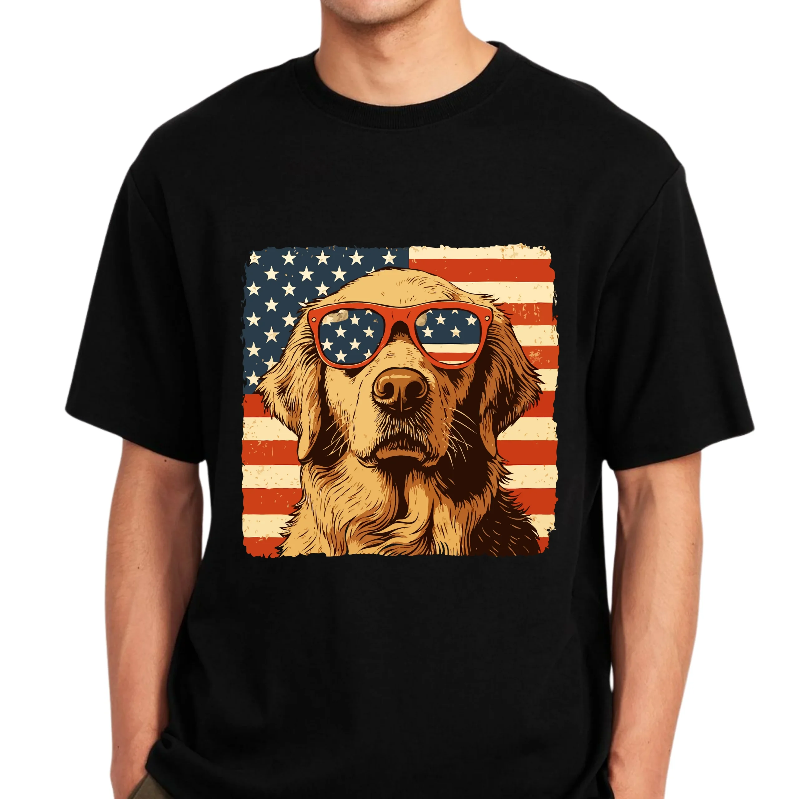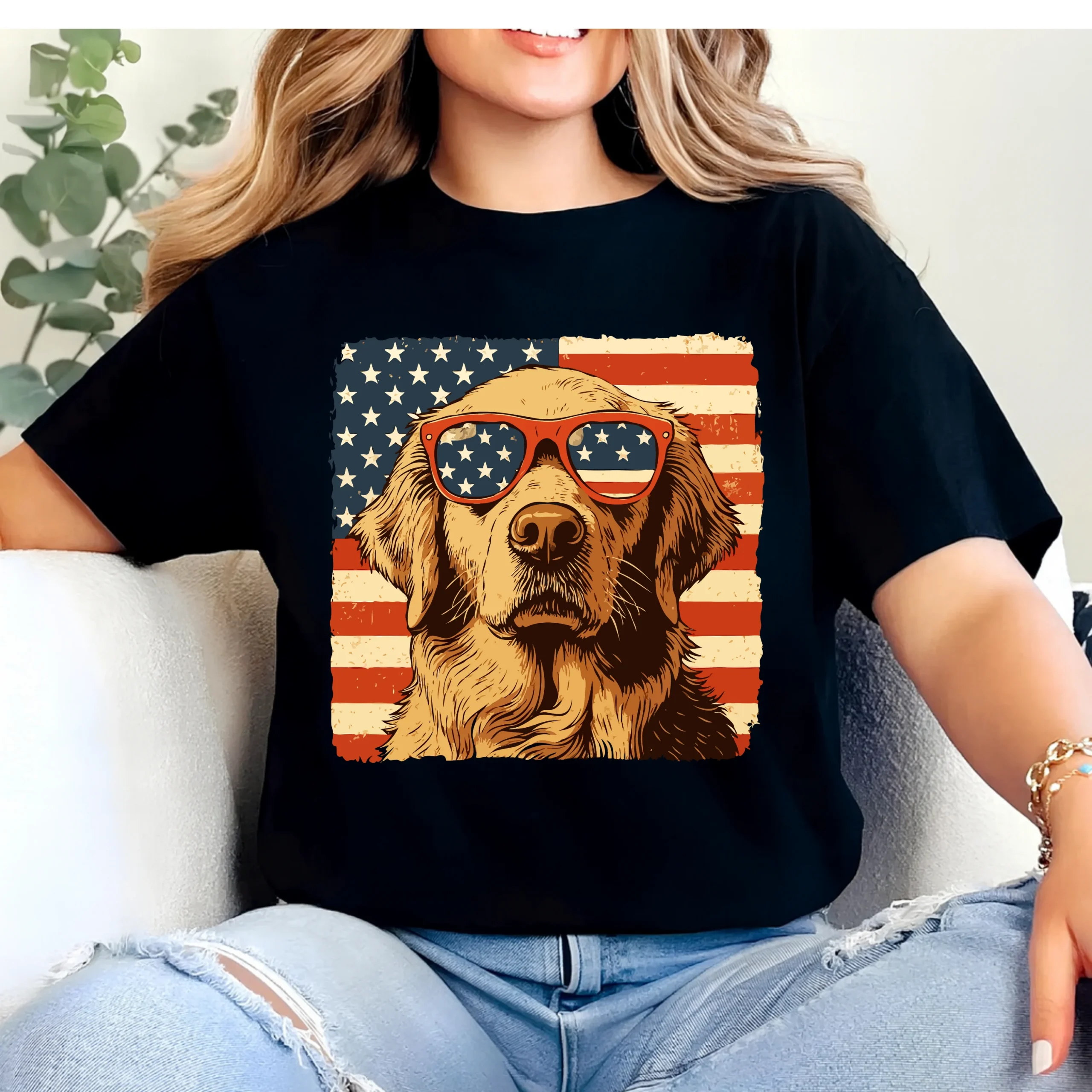 Celebrate your love for Golden Retrievers and the USA with this eye-catching patriotic t-shirt. Featuring a stylish golden retriever rocking American flag sunglasses against a bold stars-and-stripes backdrop, this design brings humor, pride, and personality together in one unforgettable look.